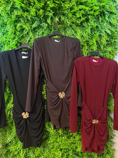 Tubino elegante a maniche lunghe con dettaglio anteriore simil fiore in oro.