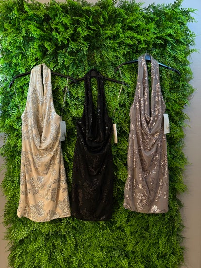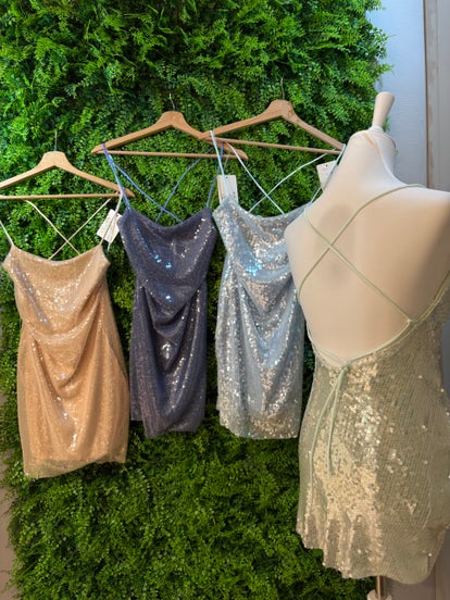 Tubino elegante in paillettes con scollo sulla schiena.