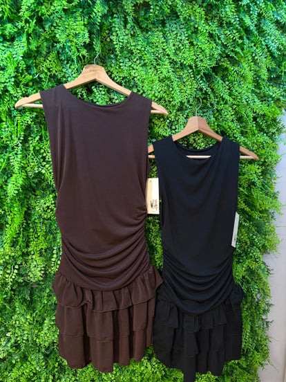 Abito elegante con arricciatura sui fianchi e gonna a balze.